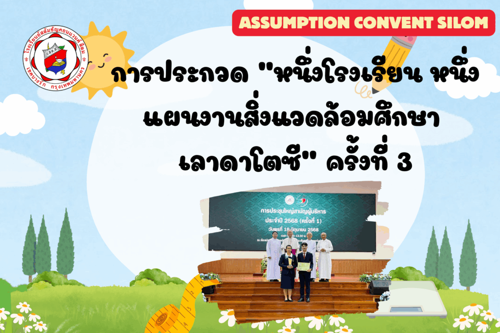 วันที่ 18 มิถุนายน 2568 โรงเรียนอัสสัมชัญคอนแวนต์ สีลม เข้ารับรางวัลเหรียญทอง D’oro Prize/โดโรไพรซ์ จากการประกวด “หนึ่งโรงเรียน หนึ่งแผนงานสิ่งแวดล้อมศึกษา เลาดาโตซี“ ครั้งที่ 3 จัดโดยฝ่ายการศึกษาและฝ่ายสังคม อัครสังฆมณฑลกรุงเทพฯ ทั้งนี้ ได้รับเกียรติจากพระอัครสังฆราชฟรังซิสเซเวียร์ วีระ อาภรณ์รัตน์ เป็นผู้มอบรางวัลอันทรงเกียรตินี้ ณ ห้องประชุมชั้น 2 อาคารนักบุญสมเด็จพระสันตะปาปา ยอห์นปอล ที่ 2 โรงเรียนยอแซฟอุปถัมภ์