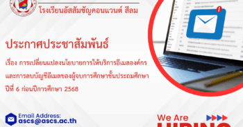 เรื่อง การเปลี่ยนแปลงนโยบายการให้บริการอีเมลองค์กร และการลบบัญชีอีเมลของผู้จบการศึกษาชั้นประถมศึกษาปีที่ 6 ก่อนปีการศึกษา 2568 เพื่อให้การบริหารจัดการระบบอีเมลองค์กรของโรงเรียนเป็นไปอย่างมีประสิทธิภาพและสอดคล้องกับนโยบายด้านความปลอดภัยสารสนเทศ โรงเรียนอัสสัมชัญคอนแวนต์ สีลม ทางโรงเรียนจะดำเนินการ ลบบัญชีอีเมลของนักเรียนระดับชั้นประถมศึกษาปีที่ 6 ที่จบการศึกษาก่อนปีกาศึกษา 2568 โดยมีรายละเอียดดำเนินการดังนี้ 1. บัญชีอีเมลองค์กรของนักเรียนที่จบการศึกษาระดับชั้นประถมศึกษาปีที่ 6 ก่อนปีการศึกษา 2568 จะถูกทะยอยระงับการใช้งานและลบออกจากระบบเริ่มตั้งแต่ วันที่ 30 พฤศจิกายน 2568 เป็นต้นไป 2. ข้อมูลภายในบัญชี ได้แก่ อีเมลที่รับ – ส่ง ไฟล์ที่จัดเก็บในระบบคลาวด์ และข้อมูลอื่นใดที่เกี่ยวข้อง จะไม่สามารถเรียกคืนได้หลังจากการลบ 3. นักเรียนปัจจุบันในปีการศึกษา 2568 ยังคงสามารถใช้บัญชีอีเมลองค์กรได้ตามปกติ และอยู่ภายใต้นโยบายการใช้งานที่โรงเรียนกำหนด โรงเรียนจะยังคงพัฒนาและทบทวนนโยบายการ ให้บริการด้านเทคโนโลยีสารสนเทศอย่างต่อเนื่อง เพื่อมอบประสบการณ์การใช้งานที่ปลอดภัย เหมาะสมต่อไป